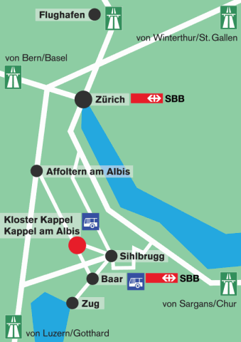 Mit der SBB nach Baar (stündliche Verbindungen), dann mit dem Postauto (Bus 280 - Hausen am Albis) direkt zum Kloster Kappel in 10 Minuten. Die Bushaltestelle «Kappel am Albis, Kloster» befindet sich direkt vor unserem Haus. Oder ab Zürich Wiedikon mit dem Postauto bis Hausen am Albis und nachher weiter mit dem Postauto 280 nach Kappel am Albis.